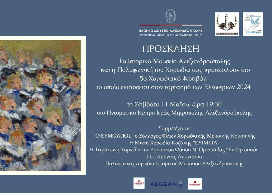 Το Ιστορικό Μουσείο Αλεξανδρούπολης και η Πολυφωνική Χορωδία του διοργανώνουν το 5ο Χορωδιακό Φεστιβάλ Αλεξανδρούπολης, το οποίο θα διεξαχθεί σήμερα, Σάββατο 11 Μαΐου 2024 και ώρα 7:30 μ.μ., στο Πνευματικό Κέντρο της Ιεράς Μητρόπολης Αλεξανδρούπολης.