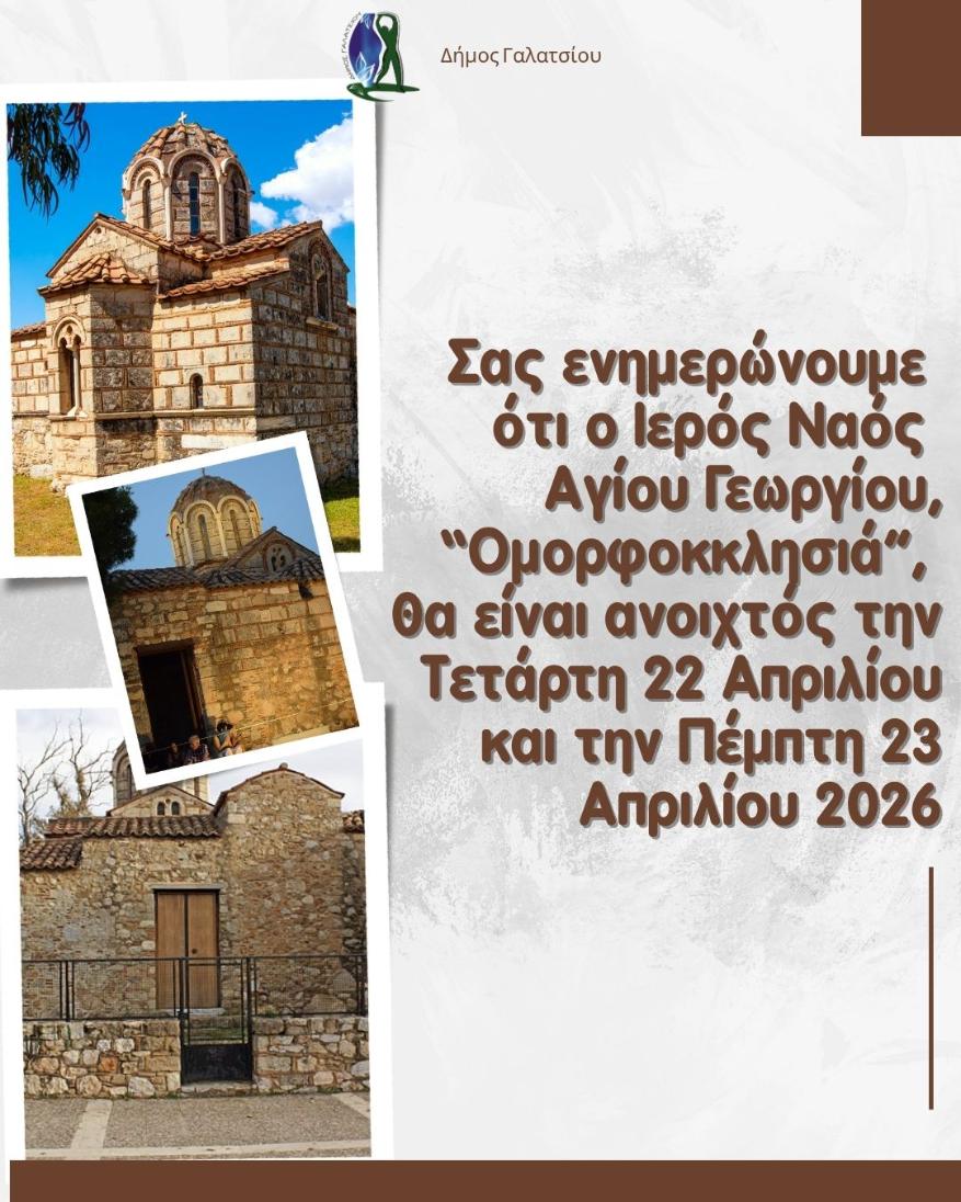 Ανοιχτός θα είναι και φέτος ο Ιερός Ναός Αγίου Γεωργίου «ΟΜΟΡΦΟΚΚΛΗΣΙΑ» στον Δήμο Γαλατσίου, την Τετάρτη 22 και την Πέμπτη 23 Απριλίου 2026