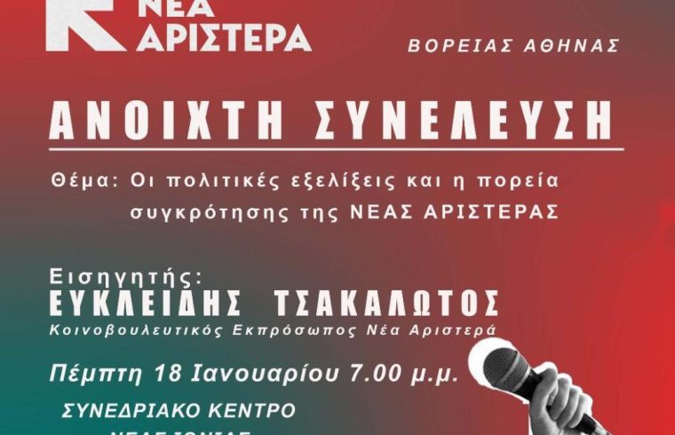 Το απόγευμα της Πέμπτης 18 Ιανουαρίου 2024, στο Δημοτικό Συνεδριακό Κέντρο Νέας Ιωνίας (Πατριάρχου Ιωακείμ 4, κοντά στον σταθμό του Ηλεκτρικού: Νέα Ιωνία), η «Νέα Αριστερά» Βόρειας Αθήνας θα πραγματοποιήσει πολιτική εκδήλωση, με κεντρικό ομιλητή τον Κοινοβουλευτικό Εκπρόσωπο της Νέας Αριστεράς κ. Ευκλείδη Τσακαλώτο, με θέμα: «Οι πολιτικές εξελίξεις και η πορεία συγκρότησης της Νέας Αριστεράς».