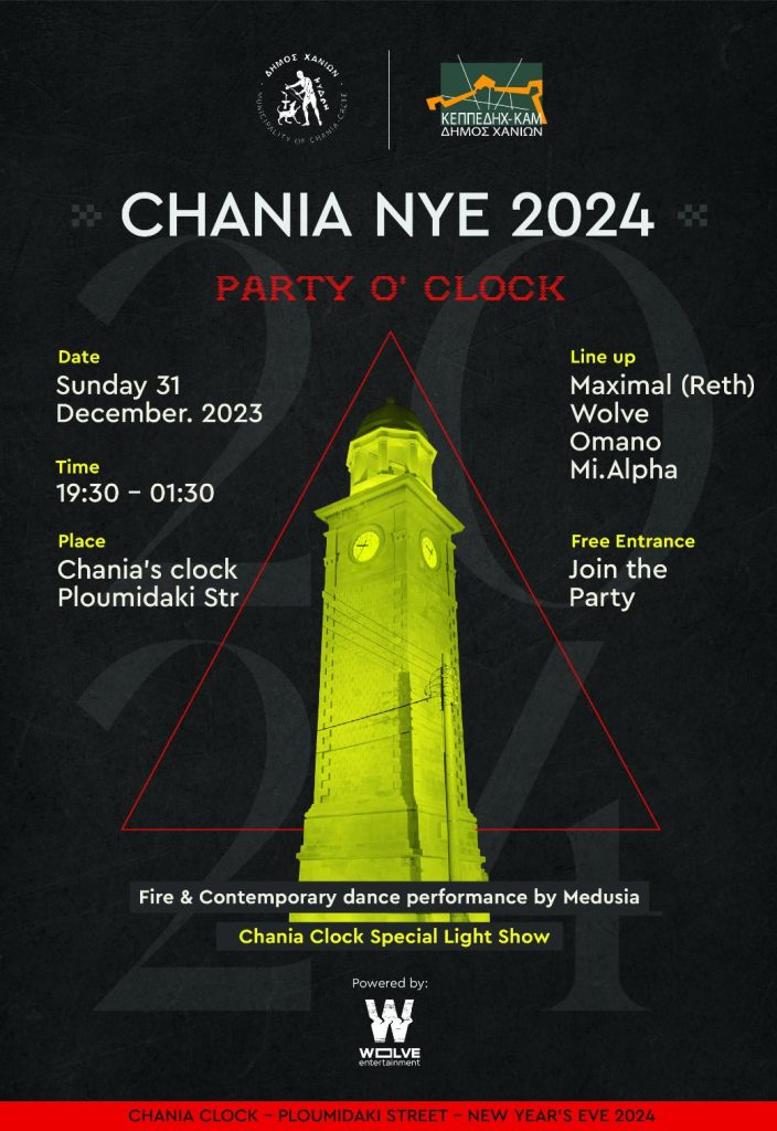 Για ακόμη μια χρονιά, ο Δήμος Χανίων και η Κοινωφελής του Επιχείρηση Πολιτισμού και Περιβάλλοντος (Κ.Ε.Π.ΠΕ.ΔΗ.Χ.-Κ.Α.Μ.), διοργανώνουν μια φαντασμαγορική εκδήλωση, ένα διασκεδαστικό πάρτι με DJ-sets, ώστε να γιορταστεί από όλες και όλους μαζί η έλευση του καινούργιου χρόνου 2024.