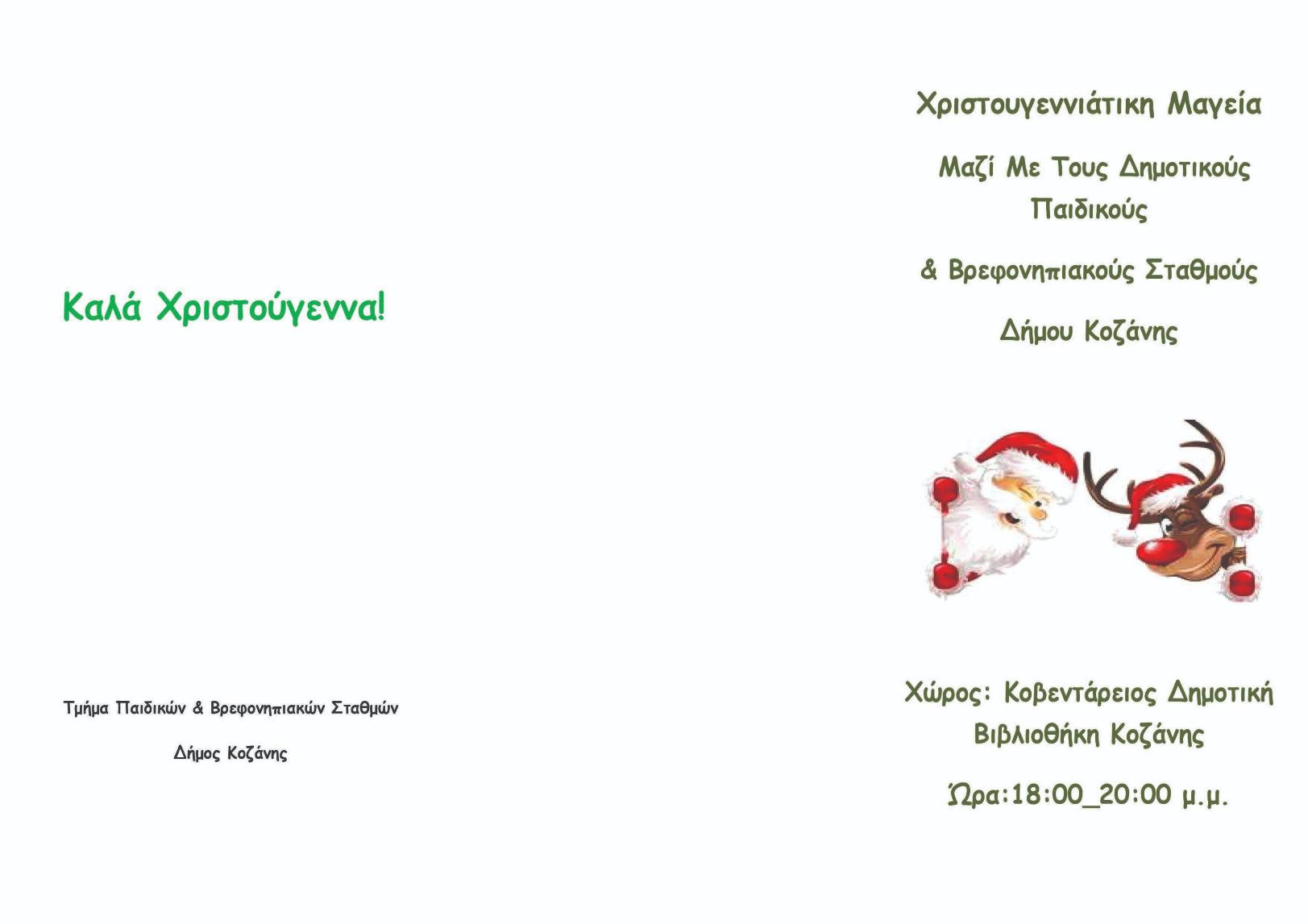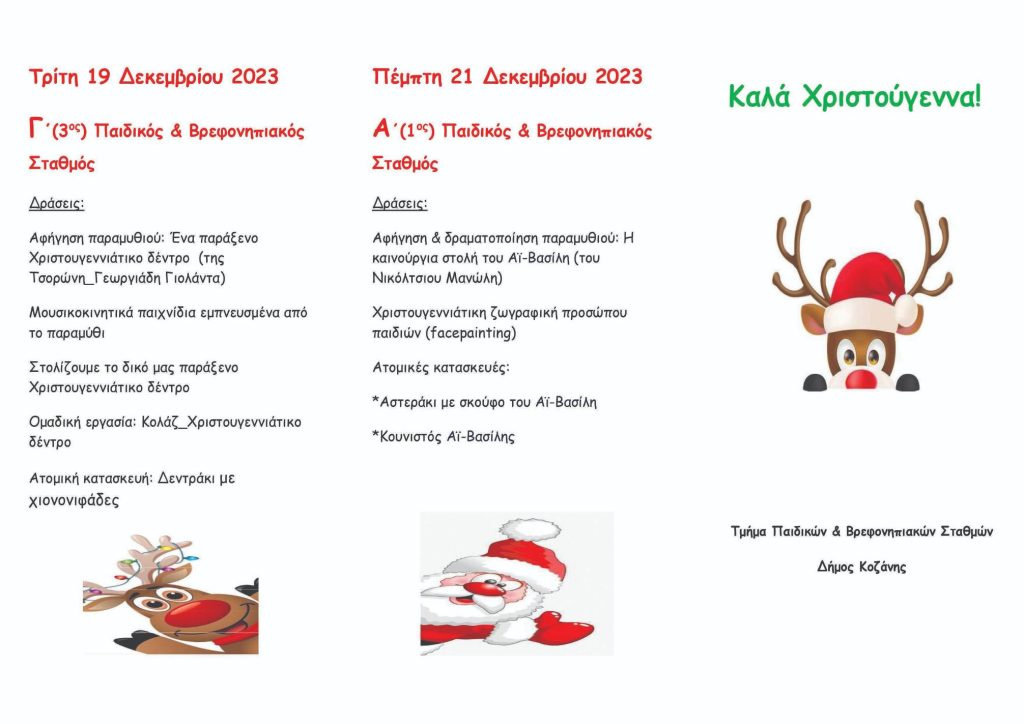 Το Τμήμα Παιδικών και Βρεφονηπιακών Σταθμών της Διεύθυνσης Κοινωνικής Προστασίας Παιδείας και Πολιτισμού του Δήμου Κοζάνης συμμετέχει στις Χριστουγεννιάτικες Δράσεις του Δήμου, που πραγματοποιούνται στον χώρο της Κοβενταρείου Δημοτικής Βιβλιοθήκης.