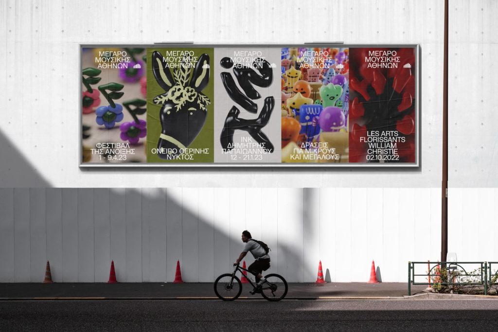 Με στόχο να μεταδώσει τη ζωντάνια και την πολυδιάστατη ταυτότητα του Μεγάρου Μουσικής Αθηνών σε όλες τις ηλικίες και σε όλο το κοινό της Ελλάδας, μια σειρά από αντικείμενα ζωντανεύουν για κάθε διαφορετική εφαρμογή. Αφίσες που λειτουργούν στατικά ή και σε κίνηση (για τα ψηφιακά μέσα) εκφράζουν τον πειραματισμό των δημιουργών τους και μετατρέπονται από δισδιάστατα σκίτσα σε κινούμενους 3D χαρακτήρες. Στην τυπογραφία, σε δεύτερο επίπεδο, επιλέχθηκε μια γραμματοσειρά και ένα μέγεθος σε όλες τις εφαρμογές, ώστε να είναι σαφής και εύστοχη, αφήνοντας την εικονογράφηση να λειτουργήσει ως κεντρικό μήνυμα. Μια επιτυχημένη σειρά αφισών, που καταφέρνει να επικοινωνήσει τις κλασικές αξίες του σχεδιασμού, εκφρασμένες με σύγχρονα εργαλεία και πρακτικές.