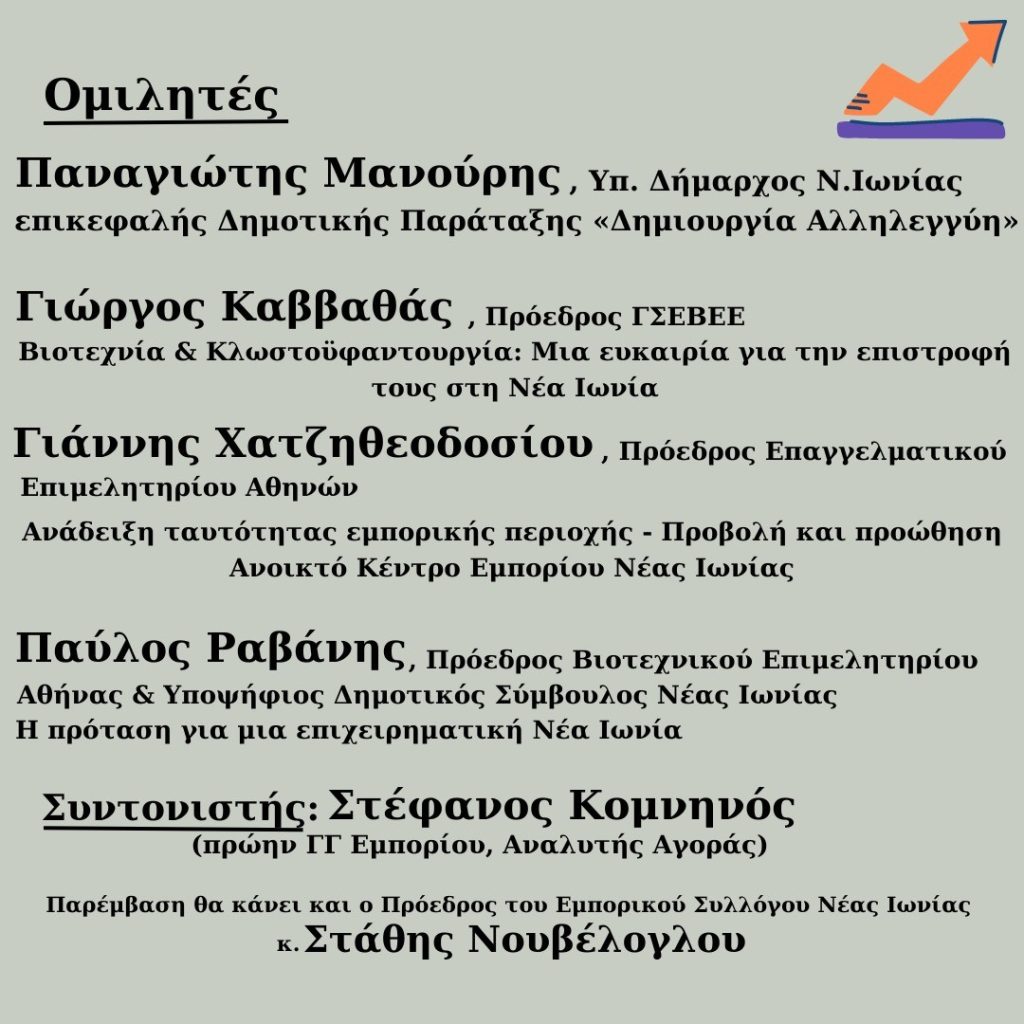 Επίσης, ο πρώην Γ.Γ. Εμπορίου, Αναλυτής Αγοράς, κ. Στέφανος Κομνηνός, θα συντονίσει την εκδήλωση, ενώ ο Πρόεδρος του Εμπορικού Συλλόγου Νέας Ιωνίας, κ. Στάθης Νουβέλογλου, θα κάνει επίκαιρη παρέμβαση.