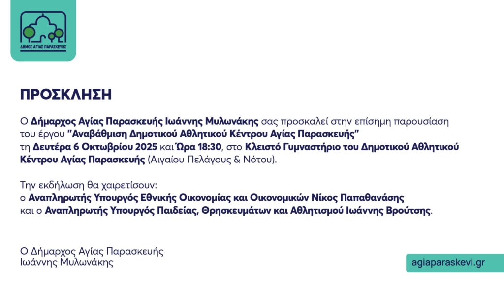 Το απόγευμα της Δευτέρας 6 Οκτωβρίου 2025, ώρα 6:30, στο Κλειστό Γυμναστήριο του Δημοτικού Αθλητικού Κέντρου Αγίας Παρασκευής (Αιγαίου Πελάγους & Νότου), θα πραγματοποιηθεί η επίσημη παρουσίασή του από τον Δήμαρχο Αγίας Παρασκευής, κ. Ιωάννη Μυλωνάκη.