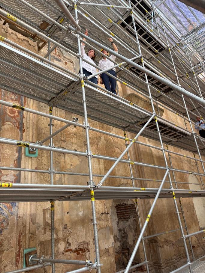 Η κ. Μενδώνη, ανεβαίνοντας στις υψηλότερες στάθμες των ικριωμάτων εργασίας, που φτάνουν τα 18 μέτρα, είχε την ευκαιρία να δει το έργο κατασκευής της ξύλινης οροφής του μνημείου και της αποκατάστασης του μιναρέ. Πρόκειται για φυσική ξυλεία χλωρής δρυός, ιδιαίτερα μεγάλων διατομών και μήκους -κάποιοι δοκοί έχουν διατομή 0,35Χ0,45 και μήκος 13,5μ.- που προέρχεται από αειφόρα διαχειριζόμενα δάση της Γαλλίας, της Ελβετίας και της Γερμανίας. Η ξυλεία που χρησιμοποιείται στην ανακατασκευή της στέγης του τεμένους διαμορφώθηκε ως προς τις διαστάσεις και πιστοποιήθηκε ως προς την αντοχή από αντίστοιχα τοπικά πριστήρια, σύμφωνα με τις προδιαγραφές που έχουν τεθεί από την εγκεκριμένη μελέτη. Ήδη έχει τοποθετηθεί το μεγαλύτερο τμήμα των ξύλων της έδρασης της στέγης στη στέψη των τοίχων και των πρώτων στρώσεων στους εσωτερικούς πεσσούς του μνημείου. Παράλληλα, είναι σε εξέλιξη η αποδόμηση του μιναρέ μέχρι τη στέψη της τοιχοποιίας, προκειμένου να ολοκληρωθεί η δομική του αποκατάσταση, με επαναχρησιμοποίηση του υλικού, που δεν έχει φθαρεί από την πυρκαγιά, και τη συμπλήρωσή του με νέο υλικό.