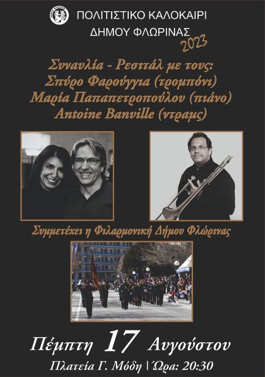 Στις 20:30, στην πλατεία Γ. Μόδη, θα δοθεί συναυλία-ρεσιτάλ με τους κ.κ. Σπύρο Φαρούγγια (τρομπόνι), Μαρία Παπαπετροπούλου (πιάνο) και Antoine Banville (ντραμς).