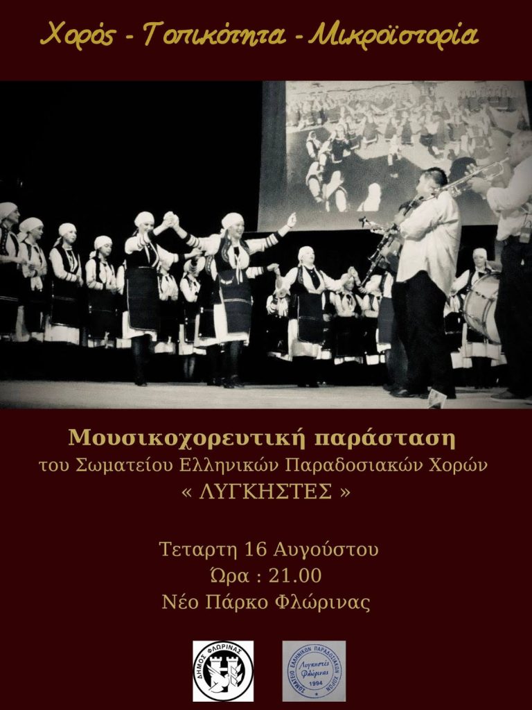 Συνεχίζονται σήμερα, Τετάρτη 16 Αυγούστου 2023, οι εκδηλώσεις του Δήμου Φλώρινας, με τον γενικό τίτλο: «Πολιτιστικό Καλοκαίρι», στο Νέο Πάρκο Φλώρινας, όπου στις 9 το βράδυ το Σωματείο Ελληνικών Παραδοσιακών Χορών «Λυγκηστές» θα παρουσιάσει τη μουσικοχορευτική παράσταση με τίτλο: «Χορός - Τοπικότητα - Μικροϊστορία».
