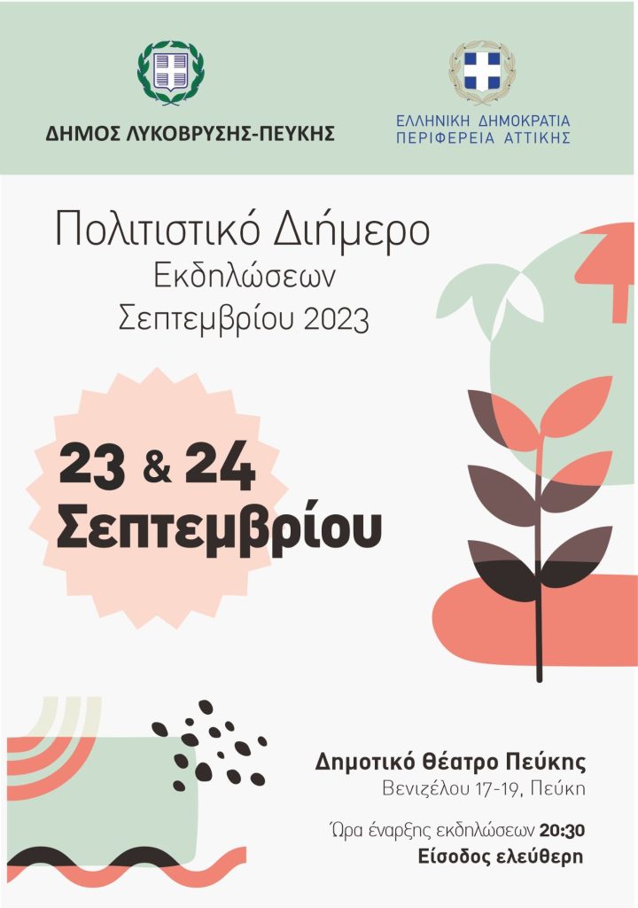 Tο Σαββατοκύριακο 23 και 24 Σεπτεμβρίου 2023 πρόκειται να πραγματοποιηθεί το Θεατρικό Πολιτιστικό Διήμερο του Δήμου Λυκόβρυσης-Πεύκης στο Δημοτικό Θέατρο Πεύκης σε συνεργασία με την Περιφέρεια Αττικής.