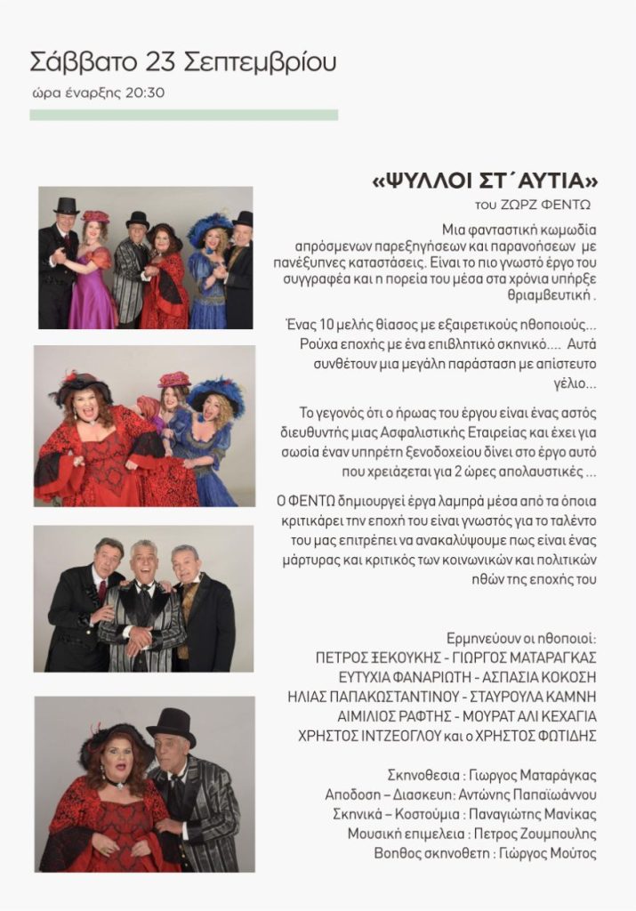 Το Σάββατο 23 Σεπτεμβρίου, ώρα 20:30, θα ανεβεί η θεατρική παράσταση με τίτλο: «Ψύλλοι στα Αυτιά», του Ζωρζ Φεντώ.