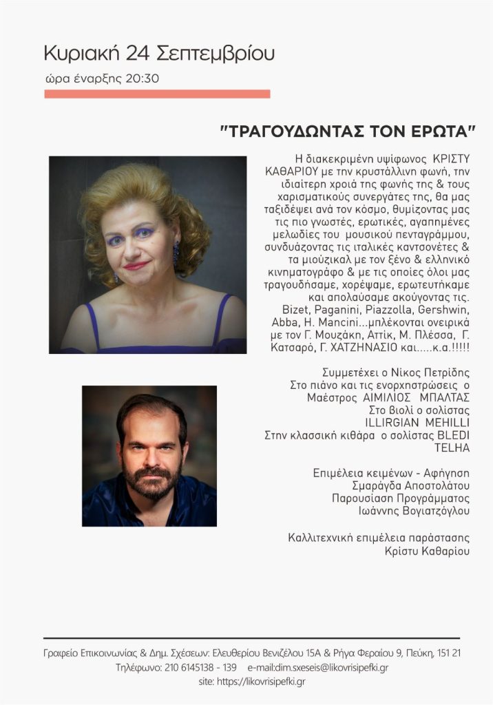 Την Κυριακή 24 Σεπτεμβρίου, ώρα 20:30, θα ανεβεί η μουσική παράσταση με τίτλο: «Τραγουδώντας τον Έρωτα».