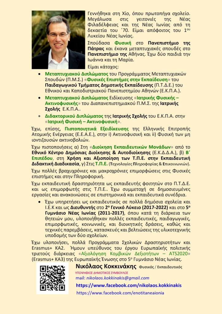 Ο Φυσικός-Εκπαιδευτικός, τ. Διευθυντής του 2ου Γενικού Λυκείου και 5ου Γυμνασίου Νέας Ιωνίας Αττικής, Δρ. Πανεπιστημίου Αθηνών (Ε.Κ.Π.Α.), κ. Νίκος Κοκκινάκης, είναι υποψήφιος δημοτικός σύμβουλος στον Δήμο Νέας Ιωνίας Αττικής, με τη δημοτική παράταξη «Ενότητα για τη Νέα Ιωνία», με επικεφαλής και υποψήφιο Δήμαρχο τον κ. Χρήστο Κανλή, διεκδικώντας την ψήφο του Ιωνιώτικου λαού, προκειμένου με όλες του τις δυνάμεις να προσφέρει στο κοινό καλό.