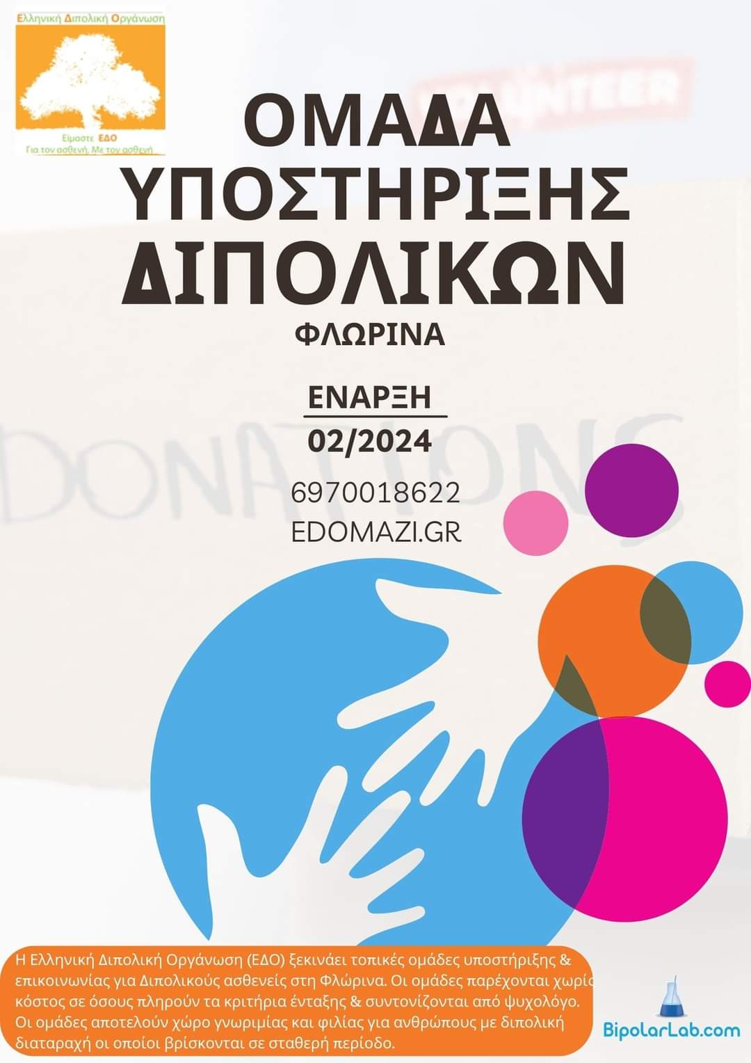 Η Ελληνική Διπολική Οργάνωση, που από το 2008 βρίσκεται στο πλευρό των Ελλήνων Διπολικών Ασθενών και των φιλικών και συγγενικών τους προσώπων, πρόκειται να διεξάγει νέες ομάδες Αυτοβοήθειας και υποστήριξης Ασθενών με Διπολική Διαταραχή και Κατάθλιψη στην πόλη της Φλώρινας, υπό την αιγίδα του Δήμου Φλώρινας, με τις ομάδες να διεξάγονται χωρίς κόστος συμμετοχής για τους ασθενείς.