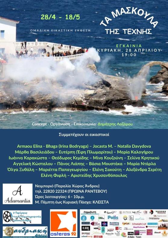 Σήμερα το απόγευμα, Κυριακή 28 Απριλίου 2024, ώρα 7, στον χώρο Τέχνης «Αδαμαντία» (Adamantia Art Space), στο Νειμποριό της Άνδρου, εγκαινιάζεται η Ομαδική Εικαστική Έκθεση, με τίτλο: «Τα μάσκουλα της Τέχνης, η οποία θα διαρκέσει έως και το Σάββατο 18 Μαΐου 2024, με ελεύθερη είσοδο, και είναι επισκέψιμη καθημερινά, και τα Σαββατοκύριακα, κατά τις ώρες 6 μ.μ. έως 10 μ.μ., εκτός της περιόδου από τη Μεγάλη Πέμπτη έως και την Κυριακή του Πάσχα.