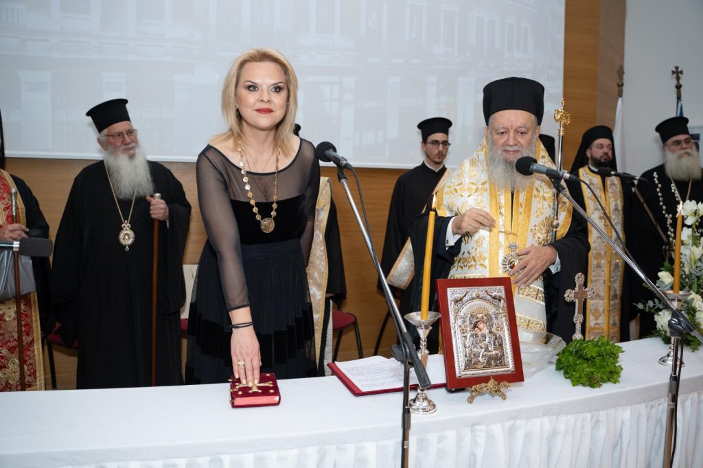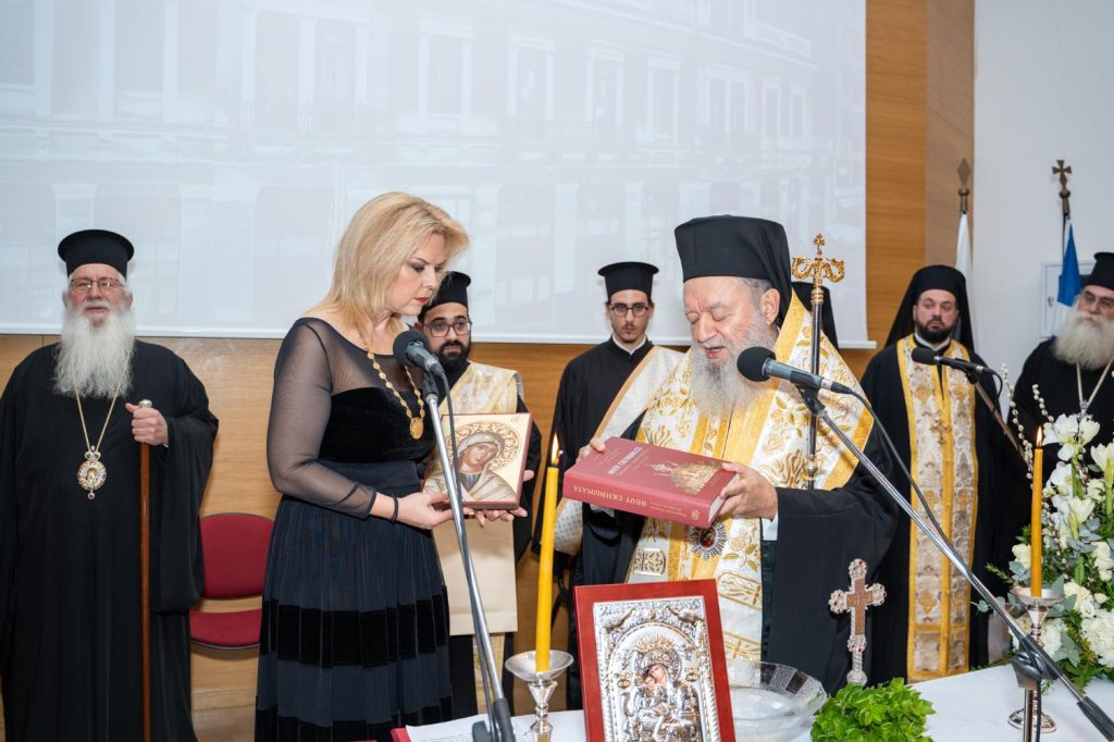 Μετά από τον Αγιασμό, ο Σεβασμιότατος κ.κ. Χρυσόστομος δώρισε στη Δήμαρχο Χαλκιδέων, κ. Έλενα Βάκα, την εικόνα της Παναγίας και έναν Τόμο με εκκλησιαστικά μνημεία της Εύβοιας, του Χαλκιδέου Γενικού Διευθυντή της Αποστολικής Διακονίας της Εκκλησίας της Ελλάδος, Σεβασμιότατου Μητροπολίτη Φαναρίου κ.κ. Αγαθαγγέλου, και ευχήθηκε τον άνωθεν φωτισμό, δύναμη και κουράγιο σε όλους όσοι εξελέγησαν. Επίσης, ο Σεβασμιότατος Μητροπολίτης κ.κ. Γεώργιος προσέφερε μια εικόνα της Παναγίας της Γλυκοφιλούσας, ευχόμενος κάθε επιτυχία στο έργο της Δημάρχου και του νέου Δημοτικού Συμβουλίου.