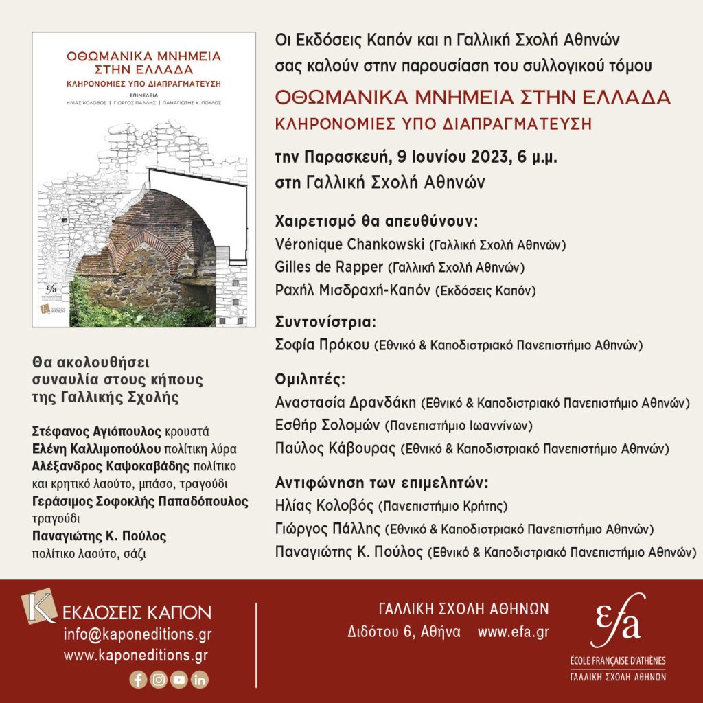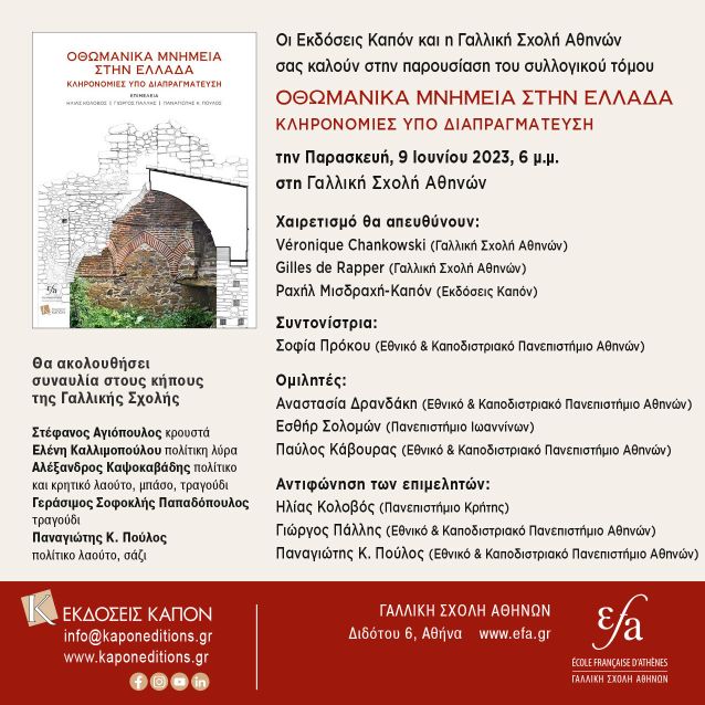 Το απόγευμα της Παρασκευής 9 Ιουνίου 2023, στην αίθουσα εκδηλώσεων της Γαλλικής Σχολής Αθηνών (Διδότου 6, Αθήνα), οι Εκδόσεις ΚΑΠΟΝ, σε συνεργασία με τη Γαλλική Σχολή, διοργανώνουν μία παρουσίαση του εξαιρετικά ενδιαφέροντος συλλογικού βιβλίου, με τίτλο: «Οθωμανικά Βιβλία στην Ελλάδα – Κληρονομιές υπό διαπραγμάτευση», σε επιμέλεια των κ.κ. Ηλία Κολοβού, Γιώργου Πάλλη και Παναγιώτη Κ. Πούλου.