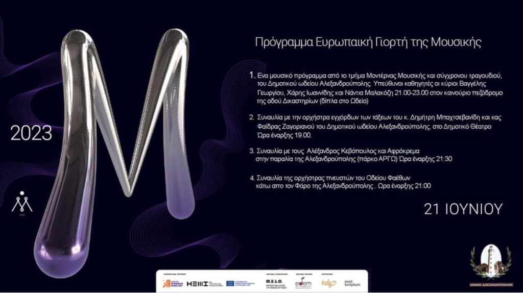 Η Αλεξανδρούπολη συμμετέχει στην Ευρωπαϊκή Γιορτή της Μουσικής 2023 και το γιορτάζει με πολλή… μουσική, στο Δημοτικό Θέατρο, στον πεζόδρομο της οδού Δικαστηρίων, στο Πάρκο Αργώ και στον ιστορικό Φάρο Αλεξανδρούπολης.