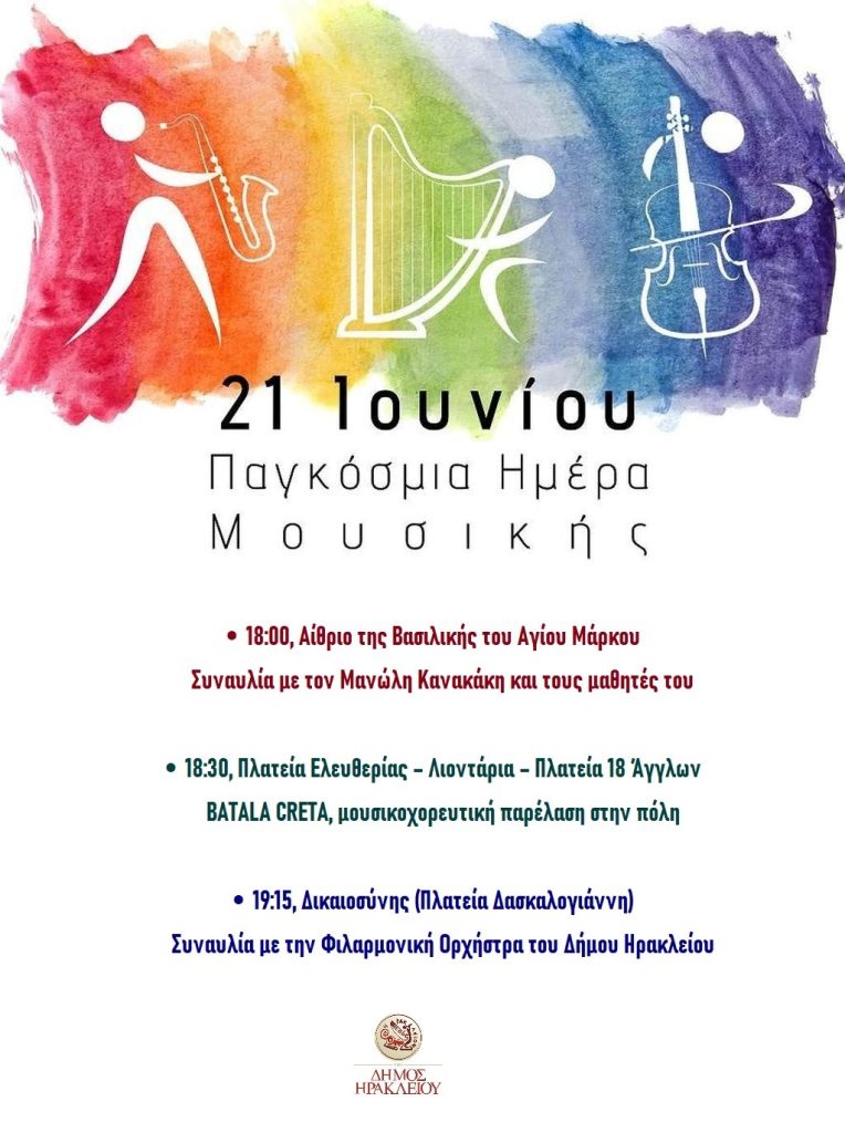 Ο Δήμος Ηρακλείου Κρήτης γιορτάζει την Παγκόσμια Ημέρα Μουσικής με τρεις παράλληλες δράσεις, οι οποίες θα πραγματοποιηθούν την Τετάρτη 21 Ιουνίου 2023.