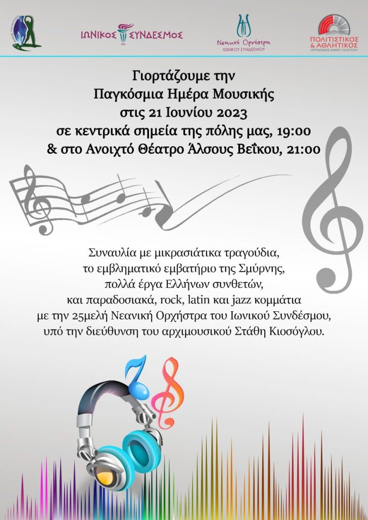 Ο Ιωνικός Σύνδεσμος και ο Πολιτιστικός & Αθλητικός Οργανισμός του Δήμου Γαλατσίου γιορτάζουν την Παγκόσμια Ημέρα Μουσικής με μια πολλά υποσχόμενη σπονδυλωτή εκδήλωση, η οποία αρχικά θα εξελίσσεται στις γειτονιές του Γαλατσίου και στη συνέχεια θα μεταμορφωθεί σε μια ολοκληρωμένη μουσική παράσταση στο Ανοιχτό Θέατρο Άλσους Βέικου, με την εξαιρετική 25μελή Νεανική Ορχήστρα του Ιωνιώτικου Συλλόγου, υπό τη Διεύθυνση του Αρχιμουσικού κ. Στάθη Κιοσόγλου.