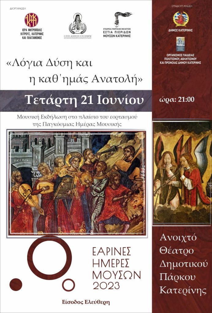 Στο πλαίσιο εορτασμού της Παγκόσμιας Ημέρας Μουσικής & των Εαρινών Ημερών Μουσών, η Μητρόπολη Κίτρους, Κατερίνης & Πλαταμώνος, η Σχολή Βυζαντινής και Παραδοσιακής Μουσικής της Ιεράς Μητροπόλεως «Όσιος Διονύσιος εν Ολύμπω» και η Εστία Πιερίδων Μουσών, σε συνεργασία με τον Δήμο Κατερίνης (Οργανισμός Πολιτισμού-Ο.Π.Π.Α.Π.), διοργανώνουν μια ενδιαφέρουσα Μουσική Εκδήλωση, με τίτλο: «Λόγια Δύση και η καθ’ ημάς Ανατολή», τιτλοφορείται η Μουσική εκδήλωση, η οποία θα πραγματοποιηθεί το βράδυ της Τετάρτης 21 Ιουνίου, στις 9, στο Ανοικτό Θέατρο του Δημοτικού Πάρκου Κατερίνης.