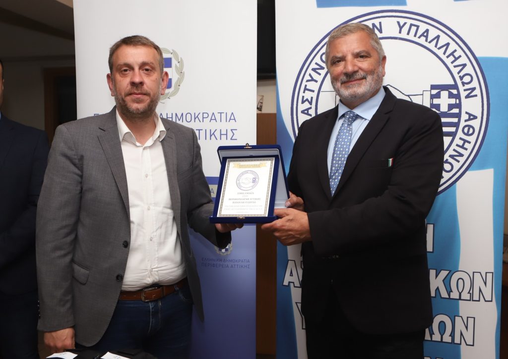 Στο πλαίσιο της τελετής παράδοσης, η Ένωση Αστυνομικών Υπαλλήλων Αθηνών έδωσε συμβολικά στον κ. Πατούλη τιμητική πλακέτα για την έως τώρα συνολική συνεισφορά του στο έργο της ΕΛ.ΑΣ..
