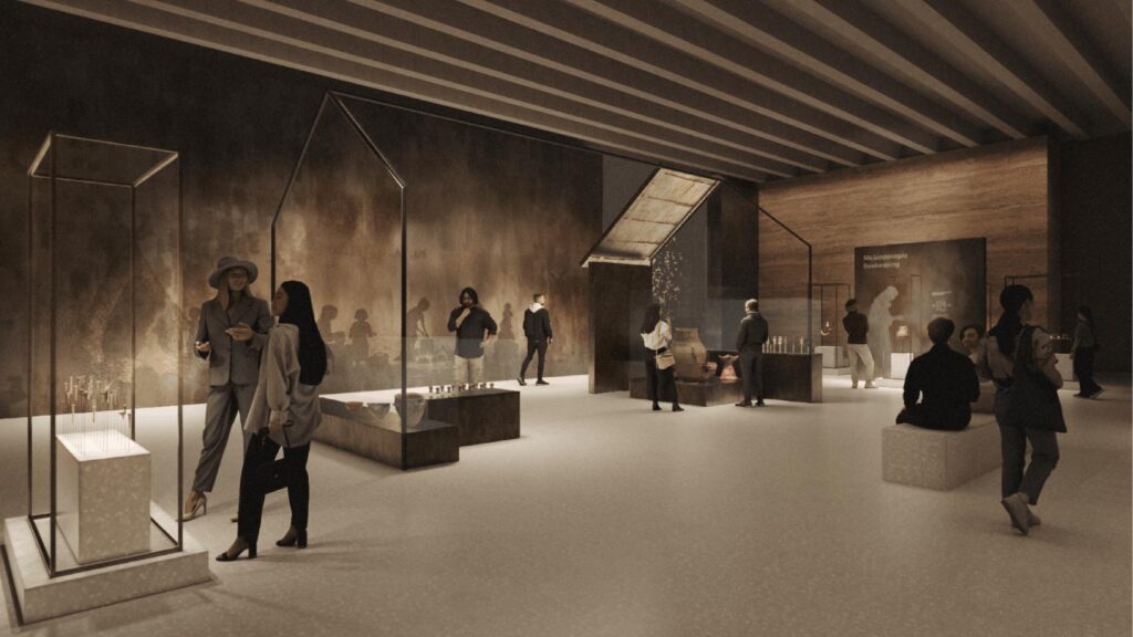 -Στη γενικότερη αισθητική των εκθεσιακών χώρων του κτηρίου (μνημείου και επέκτασης) και εν γένει του τρόπου αποτύπωσης-οπτικοποίησης του μουσειολογικού σκεπτικού και των βασικών εκθεσιακών ενοτήτων στον χώρο, παρουσιάζοντας τις εκθεσιακές ενότητες -κυρίως- μέσω της πορείας των επισκεπτών και τα επίπεδα πληροφόρησης ανάλογα με την εκθεσιακή ενότητα και τις δυνητικές επιλογές του επισκέπτη.