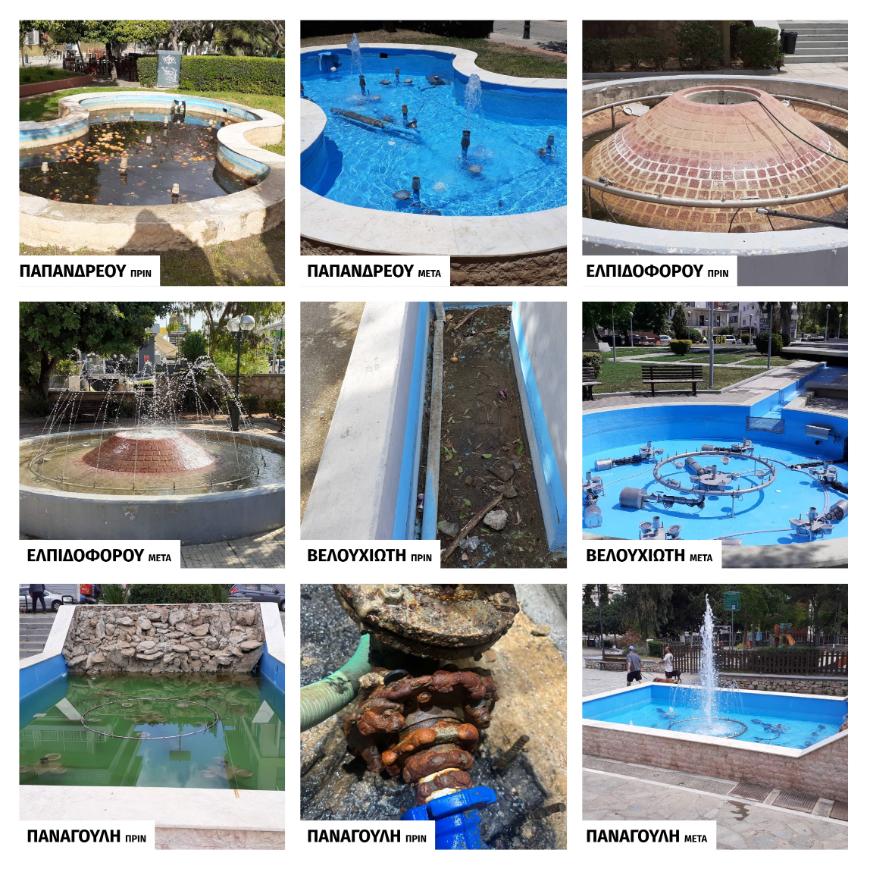 Ήδη έχουν ολοκληρωθεί οι εργασίες και λειτουργούν τα σιντριβάνια των πλατειών: Βελουχιώτη, Παπανδρέου και Παναγούλη. Τα σιντριβάνια στις συγκεκριμένες πλατείες λειτουργούν ξανά, προσφέροντας δροσιά, ομορφιά και αναβαθμίζοντας τον δημόσιο χώρο με νέα αισθητική και ασφαλή τεχνική υποδομή.