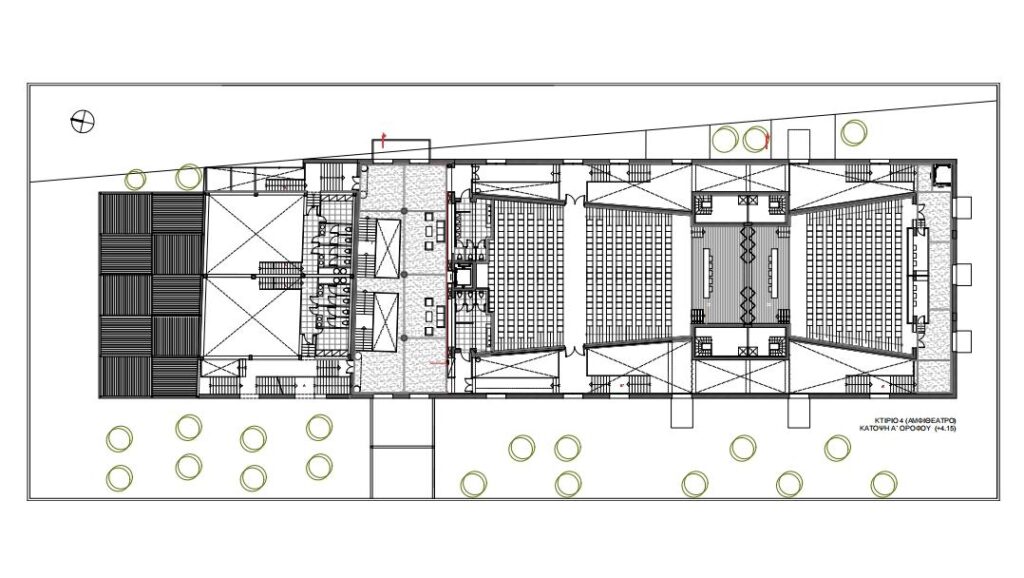 - Αμφιθέατρο 524 θέσεων (484,19 μ2), με δυνατότητα διαχωρισμού σε δύο μικρότερα αμφιθέατρα των 334 θέσεων το μεγάλο (312,9 μ2) και 190 θέσεων το μικρό (171,28 μ2), για ανεξάρτητες παράλληλες εκδηλώσεις.