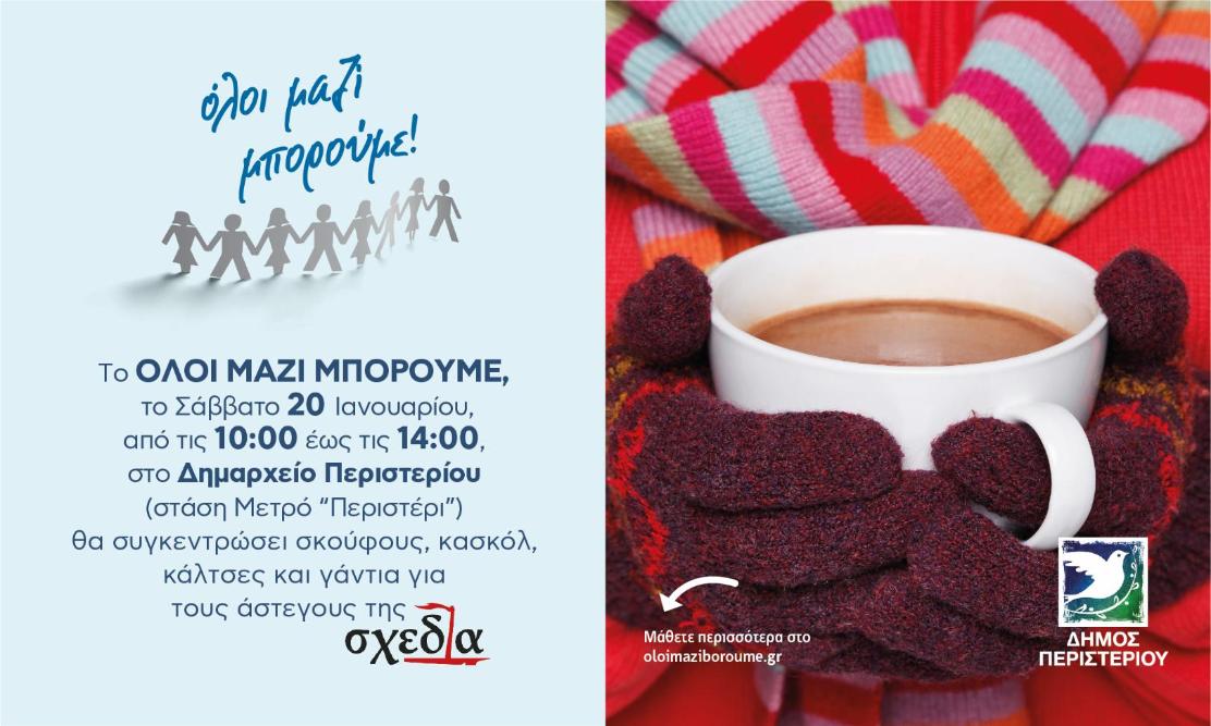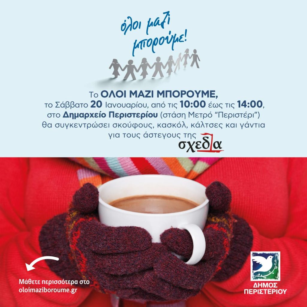 Το «Όλοι Μαζί Μπορούμε» και το περιοδικό δρόμου «ΣΧΕΔΙΑ» σε συνεργασία με τον Δήμο Περιστερίου συγκεντρώνουν σκούφους, κασκόλ, γάντια και κάλτσες, για τους άστεγους και κοινωνικά αποκλεισμένους συνανθρώπους μας.