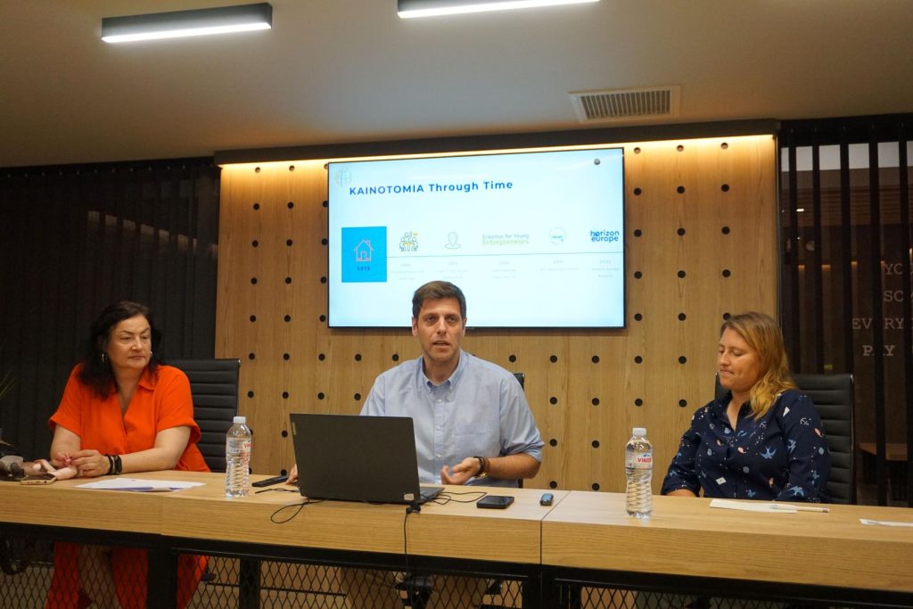 Το πρόγραμμα συνεχίστηκε με επίσκεψη στο Κέντρο Δια Βίου Μάθησης «Καινοτομία», όπου ο κ. Μιχάλης Τριανταφύλλου παρουσίασε τη λειτουργία και τις δράσεις του «Καινοτομία», το οποίο ως εταίρος στο ευρωπαϊκό έργο «EASY» διοργάνωνε, επίσης, διακρατική συνάντηση στην πόλη μας. Έτσι, οι συμμετέχοντες και των δύο έργων είχαν την ευκαιρία να αλληλεπιδράσουν συζητώντας γύρω από τις θεματικές, τους στόχους και τα αποτελέσματα των δύο έργων.