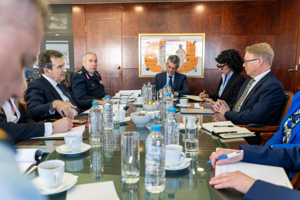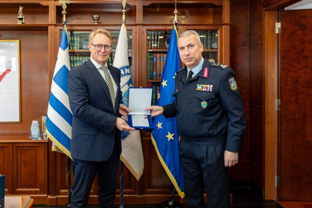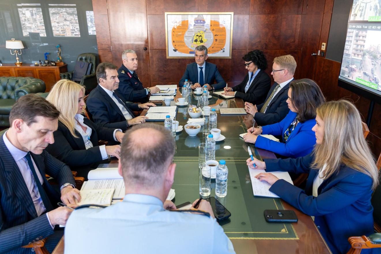 Η ενίσχυση της ήδη στενής συνεργασίας για την προστασία των εξωτερικών συνόρων της Ευρωπαϊκής Ένωσης επιβεβαιώθηκε για άλλη μια φορά στη νέα συνάντηση, που είχε ο υπουργός Προστασίας του Πολίτη, κ. Μιχάλης Χρυσοχοΐδης με τον Εκτελεστικό Διευθυντή του Frontex, κ. Χανς Λέιτενς (Hans Leijtens), παρουσία του Γενικού Γραμματέα Δημόσιας Τάξης, κ. Παναγιώτη Στάθη, και του Αρχηγού της ΕΛ.ΑΣ., Αντιστράτηγου κ. Δημητρίου Μάλλιου.