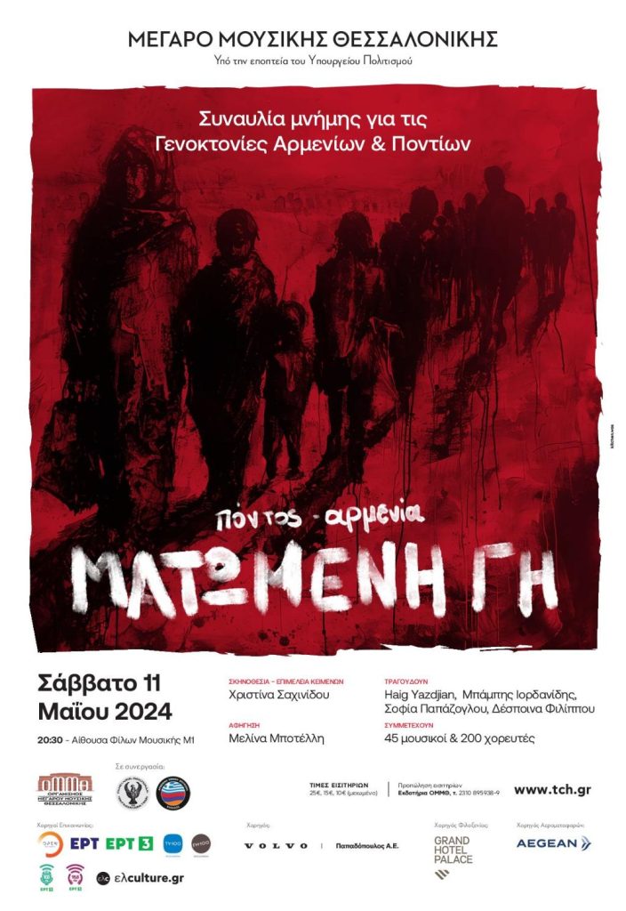 Σήμερα το βράδυ, Σάββατο 11 Μαΐου 2024 και ώρα 8:30, θα φιλοξενηθεί στην Αίθουσα «Φίλων Μουσικής Μ1» του Μεγάρου Μουσικής Θεσσαλονίκης η παράσταση: «Πόντος-Αρμενία: Ματωμένη Γη», που αποτελεί ωδή στα χώματα του Πόντου και της Αρμενίας.