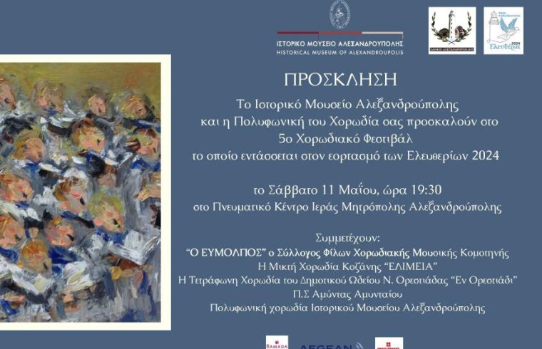 Το Ιστορικό Μουσείο Αλεξανδρούπολης και η Πολυφωνική Χορωδία του διοργανώνουν το 5ο Χορωδιακό Φεστιβάλ Αλεξανδρούπολης, το οποίο θα διεξαχθεί σήμερα, Σάββατο 11 Μαΐου 2024 και ώρα 7:30 μ.μ., στο Πνευματικό Κέντρο της Ιεράς Μητρόπολης Αλεξανδρούπολης.