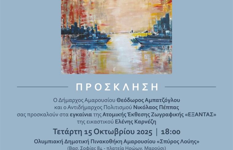 Στον φιλόξενο χώρο της Ολυμπιακής Δημοτικής Πινακοθήκης «ΣΠΥΡΟΣ ΛΟΥΗΣ» (Βασιλίσσης Σοφίας, Πλατεία Ηρώων, Μαρούσι), υπό την αιγίδα του Δήμου Αμαρουσίου, η σύγχρονη και αξιόλογη Εικαστικός, κ. Ελένη Καρνέζη, δίνει το δικό της στίγμα στην Τέχνη, παρουσιάζοντας την Ατομική Έκθεση Ζωγραφικής, με τίτλο: «ΕΞΑΝΤΑΣ», τα εγκαίνια της οποίας θα πραγματοποιηθούν την Τετάρτη 15 Οκτωβρίου 2025 και ώρα 6 μ.μ. και θα διαρκέσει έως και το Σάββατο 18 Οκτωβρίου 2025.