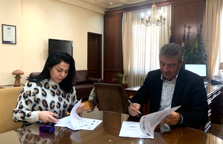 Ο Δήμαρχος Γρεβενών κ. Γιώργος Δασταμάνης και η εκπρόσωπος της αναδόχου κατασκευάστριας εταιρείας ΕΓΝΑΤΙΑ ΑΤΕΒΕ συνυπέγραψαν τη σύμβαση του έργου της ενεργειακής αναβάθμισης του Δημαρχείου Γρεβενών, με την οποία εξασφαλίζεται η ριζική ανάπλασή του.