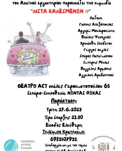 Το πολιτιστικό σωματείο «Αχαϊκό Εργαστήρι», με τη θεατρική ομάδα «ΣΥΝ-ΔΡΑΣΗ» και τη στήριξη του Τομέα Πολιτισμού Π.Ε. Αχαΐας της Περιφέρεια Δυτικής Ελλάδας, θα παρουσιάσουν στο θέατρο «ACT» (σκάλες Γεροκωστοπούλου 65), την Τρίτη 27 Ιουνίου 2023, ώρα 21:30, τη θεατρική παράσταση «Λίστα Καλεσμένων», σε σενάριο και σκηνοθεσία του κ. Νώντα Φωκά, με ελεύθερη είσοδο για το κοινό.