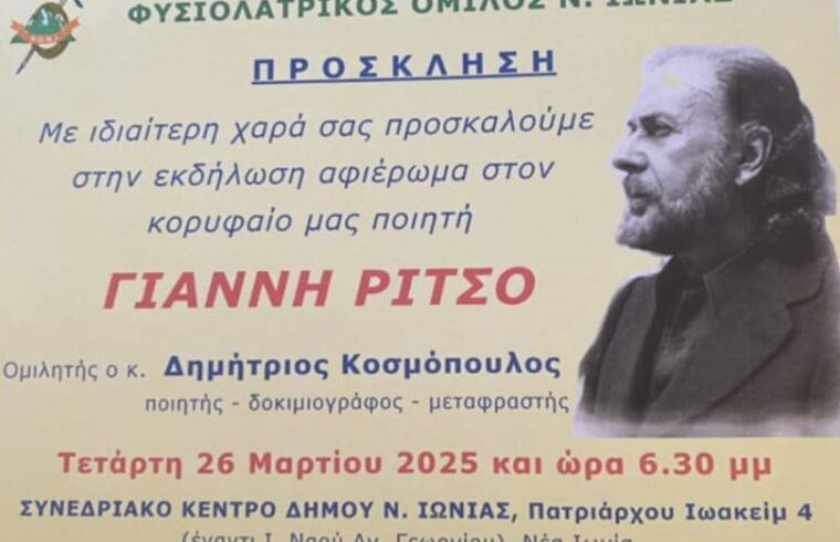 Το απόγευμα της Τετάρτης 26 Μαρτίου 2025 και ώρα 6:30, ο Φυσιολατρικός Όμιλος Νέας Ιωνίας (Φ.Ο.Ν.Ι.) διοργανώνει μία εκδήλωση-ειδικό αφιέρωμα για τον Ποιητή της Ρωμιοσύνης, Γιάννη Ρίτσο, η οποία θα πραγματοποιηθεί στο Δημοτικό Συνεδριακό Κέντρο Νέας Ιωνίας Αττικής (Πατριάρχου Ιωακείμ 4, έναντι Ιερού Ναού Αγίου Γεωργίου, κοντά στον σταθμό του Ηλεκτρικού: Νέα Ιωνία), με ΕΛΕΥΘΕΡΗ ΕΙΣΟΔΟ.