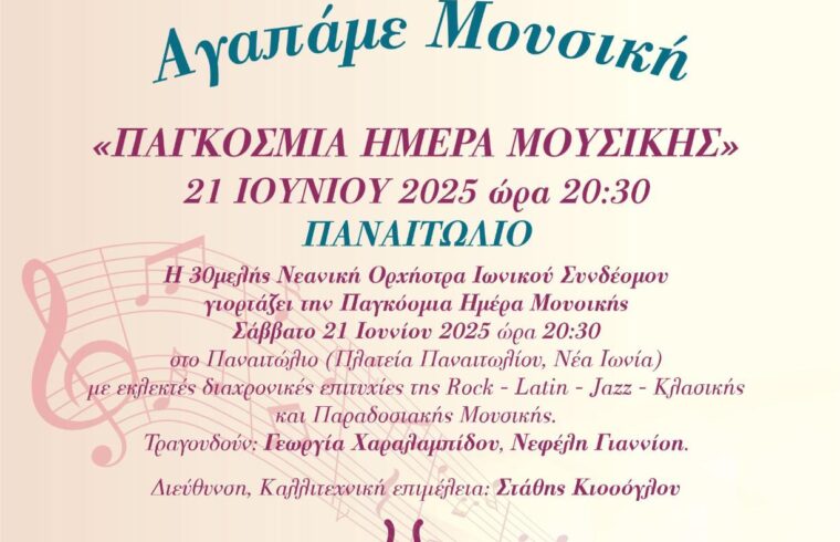Ο Ιωνικός Σύνδεσμος, τιμώντας την Παγκόσμια Ημέρα Μουσικής, διοργανώνει την Παρασκευή 20 Ιουνίου 2025, ώρα 20:30, και το Σάββατο 21 Ιουνίου 2025, ώρα 20:30, δύο σημαντικές μουσικές εκδηλώσεις, στον χώρο της Πλατείας του Παναιτωλίου, στη Νέα Ιωνία Αττικής.