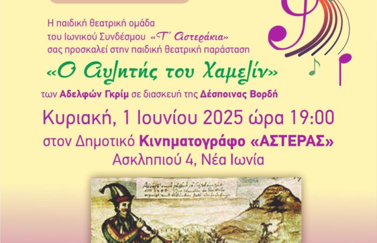 Το απόγευμα της Κυριακής 1 Ιουνίου 2025 και ώρα 7, η Παιδική Θεατρική Ομάδα του Ιωνικού Συνδέσμου: «Τ’ Αστεράκια», θα παρουσιάσει την παιδική θεατρική παράσταση με τίτλο: «Ο Αυλητής του Χαμελίν», των Αδελφών Γκριμ.