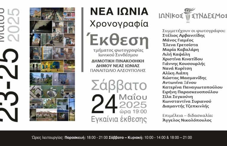 Mία πραγματικά ενδιαφέρουσα Έκθεση Φωτογραφίας, με τον γενικό τίτλο: «Νέα Ιωνία-Χρονογραφία: Φωτογραφίζοντας τη ροή του χρόνου», διοργάνωσε ο Ιωνικός Σύνδεσμος, με πρωτοβουλία του Φωτογραφικού Τμήματός του, η οποία εγκαινιάστηκε επίσημα το απόγευμα του Σαββάτου 24 Μαΐου 2025, στη Δημοτική Πινακοθήκη του Δήμου Νέας Ιωνίας Αττικής, στο Παναιτώλιο της Αλσούπολης, παρουσία πλήθους φίλων της Τέχνης της Φωτογραφίας.