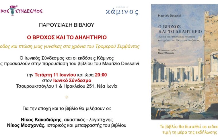 Ο Ιωνικός Σύνδεσμος και οι Εκδόσεις «Κάμινος» διοργανώνουν την παρουσίαση του βιβλίου του Maurizio Dessalvi, με τίτλο: «Ο ΒΡΟΧΟΣ ΚΑΙ ΤΟ ΔΗΛΗΤΗΡΙΟ», η οποία θα γίνει την Τετάρτη 11 Ιουνίου 2025, ώρα 8 μ.μ., στην αίθουσα εκδηλώσεων του Ιωνικού Συνδέσμου (Τσουρουκτσόγλου 1 & Ηρακλείου 251, Νέα Ιωνία Αττικής).