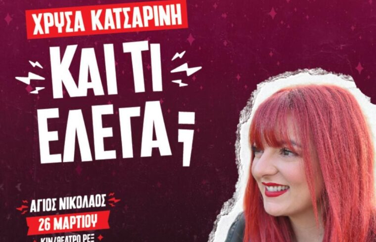 Η Χρύσα Κατσαρίνη παρουσιάζει τη νέα της stand up comedy παράσταση, με τίτλο: «ΚΑΙ ΤΙ ΕΛΕΓΑ;», στον Άγιο Νικόλαο Λασιθίου, την Πέμπτη 26 Μαρτίου 2026 στο Κινηματοθέατρο REX.