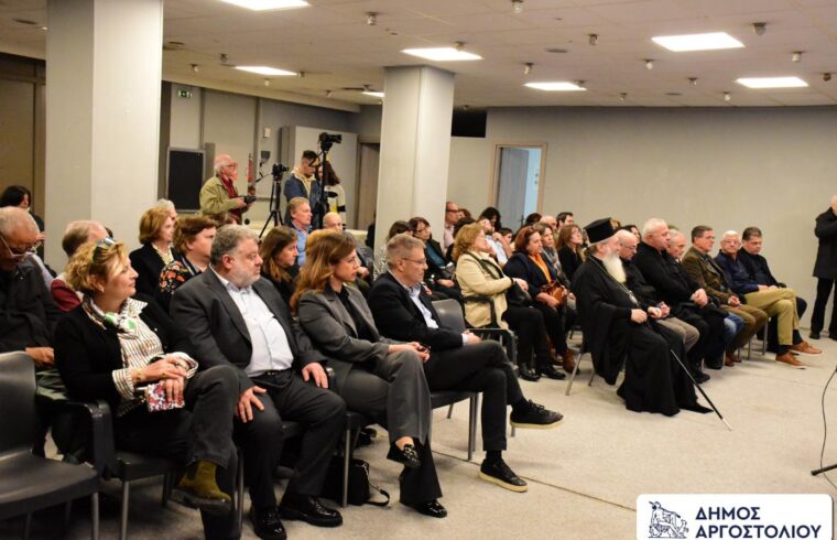 Ο Δήμαρχος Αργοστολίου κ. Θεόφιλος Μιχαλάτος, ο Πρόεδρος του Δημοτικού Συμβουλίου κ. Νικόλας Βαλλιανάτος, οι Αντιδήμαρχοι κ.κ. Διονύσης Μινέτος και Διονύσης Κωνσταντάτος, παραβρέθηκαν στο Δημοτικό Θέατρο Αργοστολίου «Ο Κέφαλος», στην εκδήλωση που συνδιοργάνωσαν η Εφορεία Αρχαιοτήτων Κεφαλληνίας και Ιθάκης και ο Δήμος Αργοστολίου, με θέμα: «Στα ίχνη πολεμιστή ηλικίας 3.274 ετών».