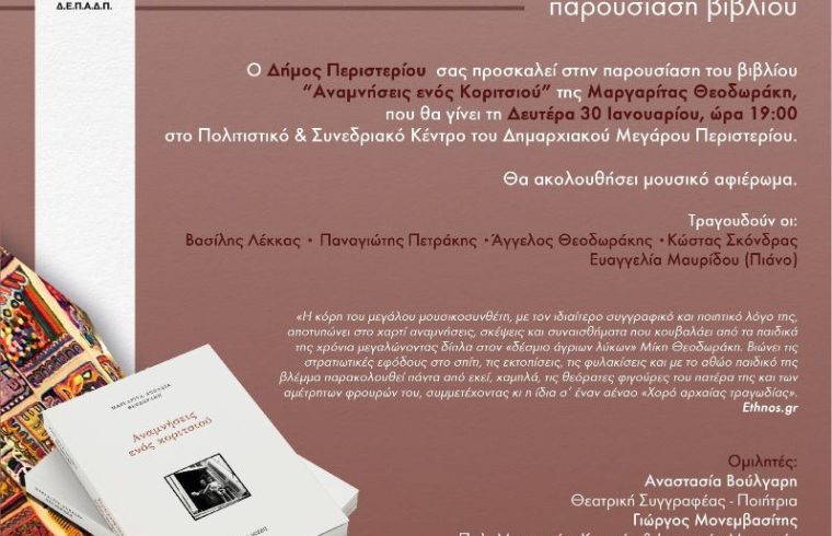 Το απόγευμα της Δευτέρας 30 Ιανουαρίου, ώρα 7, ο Δήμος Περιστερίου διοργανώνει την εκδήλωση παρουσίασης του βιβλίου της κ. Μαργαρίτας Θεοδωράκη, με τίτλο: «Αναμνήσεις ενός κοριτσιού», που θα πραγματοποιηθεί στο […]