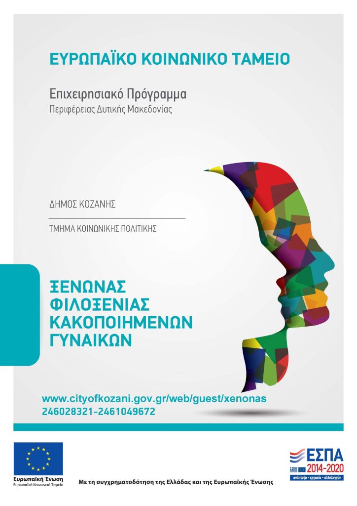 Ο Ξενώνας Φιλοξενίας Γυναικών Δήμου Κοζάνης συγχρηματοδοτείται από την Ελλάδα και την Ευρωπαϊκή Ένωση, στο πλαίσιο του Περιφερειακού Επιχειρησιακού Προγράμματος Δυτικής Μακεδονίας 2014-2020.
