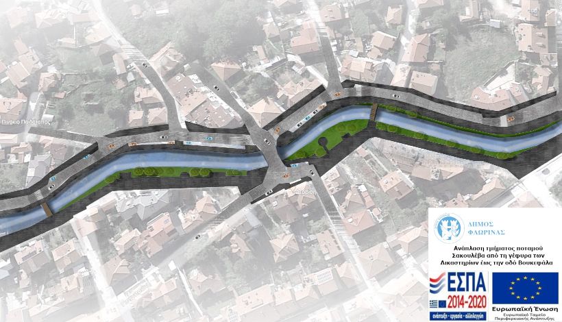 Η περιοχή παρέμβασης ξεκινά από το ύψος των Δικαστηρίων Φλώρινας και εκτείνεται παραποτάμια έως την οδό Βουκεφάλα και ακόμη προβλέπεται η δημιουργία νέων πεζοδρομίων και η διαπλάτυνση των υφιστάμενων σε όλο το μήκος του έργου, η δημιουργία χώρων στάθμευσης και χώρων πρασίνου, η τοποθέτηση αστικού εξοπλισμού, η τοποθέτηση φωτιστικών νέας τεχνολογίας, η αντικατάσταση της τσιμεντένιας πεζογέφυρας πλησίον των Δικαστηρίων με μια νέα μεταλλική, η κατασκευή τριών νέων πεζογεφυρών και η διευθέτηση της κοίτης, ούτως ώστε να μεταφερθεί η ροή του νερού μακριά από τους πλευρικούς τοίχους του ποταμού, όπου έχουν σχηματιστεί υπόσκαπτα, με κίνδυνο κατάρρευσής τους και κατά συνέπεια κατάρρευσης του οδοστρώματος των παραποτάμιων οδών.